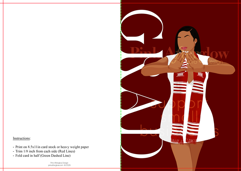 A Sorority Brown Girl, with straight hair, wearing a white dress with a red and white stole, standing in a popular D9 sorority specific hand pose with a red background.