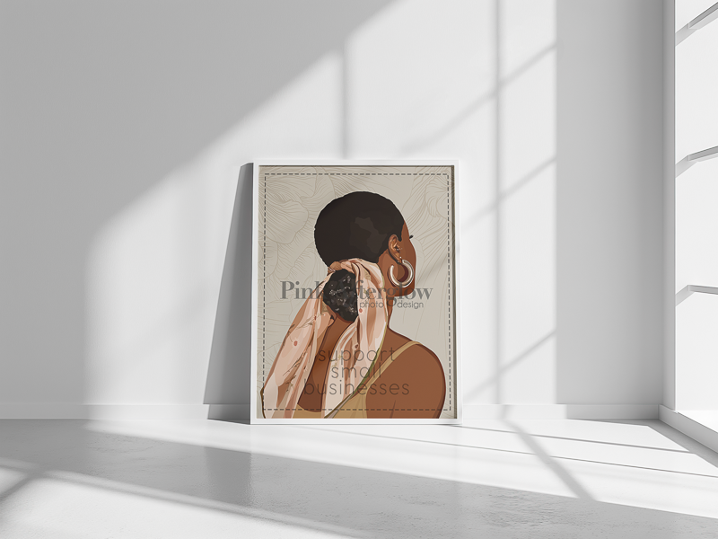A Black Girl looking away as she reflects on events of the past. Her hair is styled with a low bun and scarf and she is wearing a large hoop earrings.